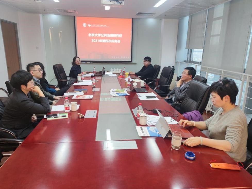 12月21日,北京大学公共治理研究所2021年度第四次所务会在廖凯原楼举行,研究所所长燕继荣,副所长李海燕、严洁、黄璜、句华及行政人员参加了会议。