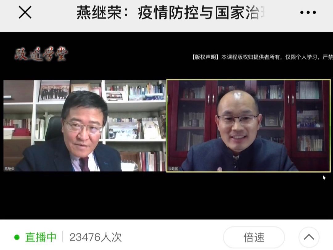 4月22日晚8点,北京大学政府管理学院高层教育中心开设网络公益系列讲座“政道学堂”,北京大学公共治理研究所所长燕继荣教授以《疫情防控与国家治理现代化》为题,作首讲直播课。本次课程由高层教育中心执行主任李延国老师主持,吸引了近2.5万观众在线收看。