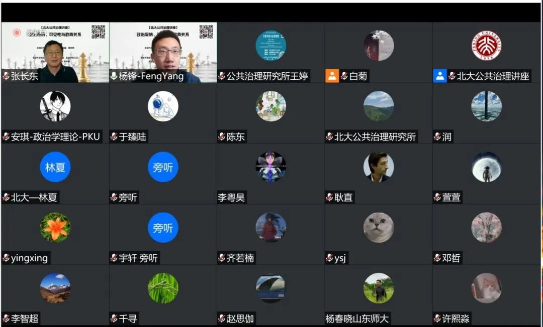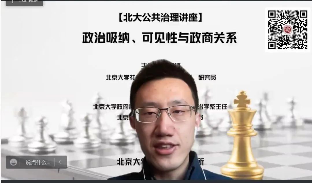 5月26日上午,由北京大学公共治理研究所主办的北大公共治理讲座“政治吸纳、可见性与政商关系”在线上举行。北京大学社会研究中心助理教授、研究员杨锋发表学术演讲,150余位师生参与了本次讲座。讲座由北京大学政府管理学院长聘副教授、北京大学公共治理研究所研究员张长东主持。