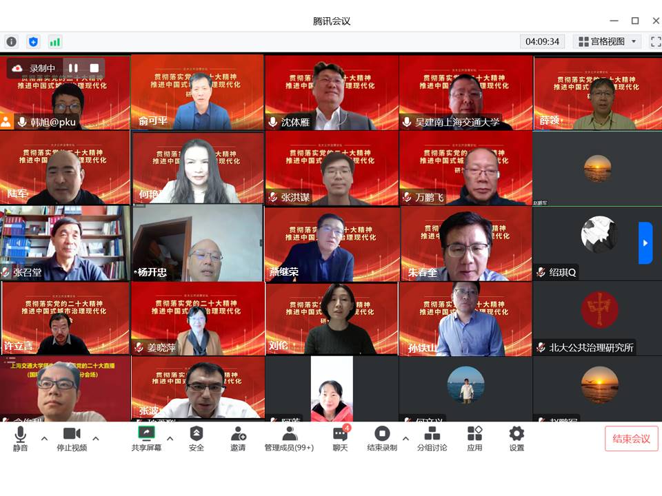 10月29日,由北京大学政府管理学院、北京大学公共治理研究所、北京大学城市治理研究院主办的北大公共治理论坛“城市治理现代化研讨会”在线举行。本次研讨会以“贯彻落实党的二十大精神,推进中国式城市治理现代化”为主题,旨在学习党的二十大报告,研讨如何推进中国式城市治理现代化,践行中国式现代化,促进北京大学城市与区域管理学科发展。来自北京大学、中国人民大学、中国社会科学院、复旦大学、上海交通大学、四川大学等高校和科研机构的五百余位师生参加了会议。北京大学政府管理学院沈体雁教授、薛领教授和陆军教授分别主持了上午的主论坛和下午的分论坛。