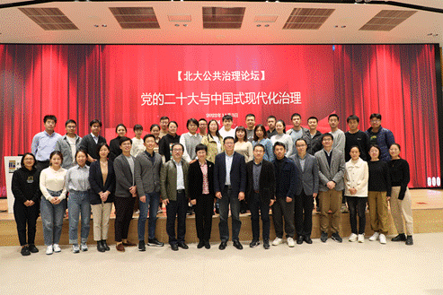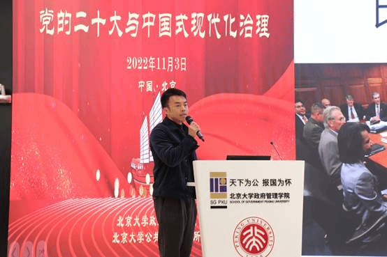 北京大学政府管理学院院长、北京大学公共治理研究所所长燕继荣教授致辞。他要求各位师生认真学习和领悟党的二十大报告和精神,鼓励广大学者通过学术话语传递党的二十大声音,尤其青年学者要勇于承担薪火相传的责任,将学术观点与党的二十大精神紧密联系,提出解决有关议题的方针政策。