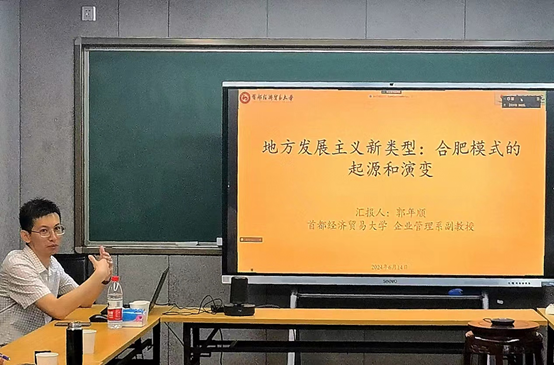 2024年6月14日上午,由北京大学公共治理研究所支持的“科创政策与工业行政2024讲座系列Ⅱ”在廖凯原楼成功举办。本次研讨会以“地方发展主义新类型:合肥模式的起源和演变”为主题,由首都经济贸易大学企业管理系副教授郭年顺主讲。研讨会由北京大学政府管理学院长聘副教授、公共治理研究所研究员封凯栋主持,来自北京大学、清华大学、中央党校、中国科学院、厦门大学、河北经贸大学、澳大利亚国立大学和中金研究院等不同机构的20余位教授、研究员和研究生参与了本次会议。