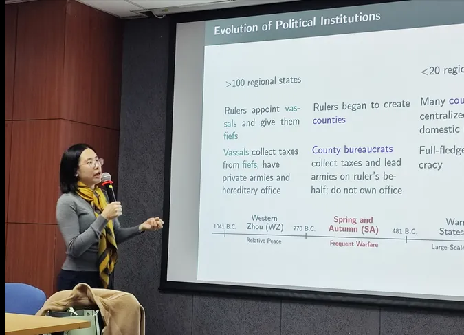 随后,陈老师介绍了中国历史上分裂与统一交替演变的政治发展特征,并具体分析了三个政治上外重内轻时期的国家建构。首先,对于春秋时期的国家建构,陈老师对军事-财政模型进行反思,指出进攻性军事需求会刺激统治者的中央集权,而防御性军事需求则推动地方分权,进而塑造了国家建构的不同结果。其次,北魏时期国家建构面临的核心问题是如何化解地方精英对中央集权的抵抗。北魏统治者通过官僚录用对地方实权派给予了政治补偿,实现了有利于中央集权的利益重塑,为中国再统一奠定了重要基础。最后,中晚唐时期的统治者需要处理和大量的地方军事实权家的关系。对此,陈老师讨论了统治者的军事集权改革对国家强制能力的影响,指出这种影响在国家上层秩序和基层秩序上存在差异。