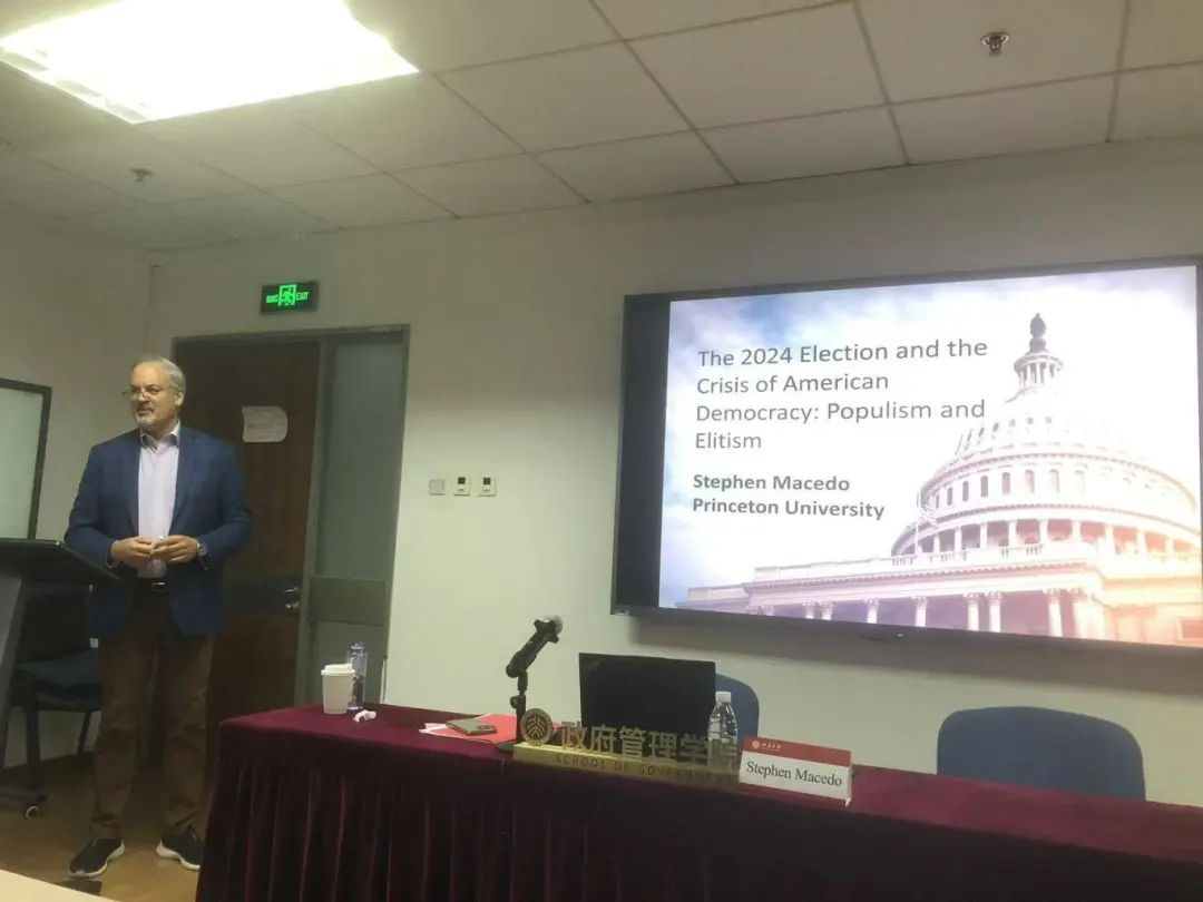 2024年10月17日,主题为“美国民主的危机与民粹主义和精英主义再思考”的学术讲座在北京大学政府管理学院126教室举办。讲座由美国著名政治理论家、美国人文艺术科学院院士、美国艺术与文学学院院士、美国政治与法哲学学会前任会长、普林斯顿大学Laurance S. Rockefeller讲座教授史蒂芬·马塞多(Stephen Macedo)主讲,密集探讨了与2024年美国总统大选紧密相关的多重政治议题。北京大学政府管理学院长聘副教授、公共治理研究所研究员段德敏主持了本次讲座,多位校内外师友参与了讨论。