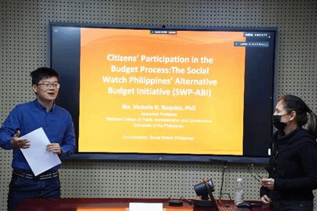 2024年11月8日晚,主题为“公民参与国家预算过程:菲律宾社会观察运动的替代预算倡议“的学术讲座在北京大学政府管理学院305室举办。受北京大学公共治理研究所研究员杨立华教授邀请,讲座由北京大学政府管理学院访问学者、菲律宾大学公共行政与治理学院(NCPAG)的副教授——Maria Victoria R. Raquiza博士主讲。北京大学政府管理学院博雅博士后马壹主持了本次讲座。讲座采取线上与线下相结合的形式,吸引北京大学、清华大学校内外各院系师生近40余人参与。