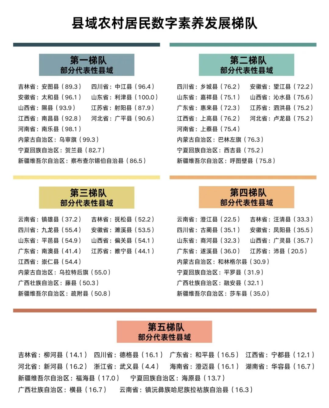 数字素养指数采用0-100标准化分值,对县域农村居民的数字技术使用结构进行相对刻画。分值越高,表明该地区居民在学习、政务、健康、出行等功能性应用场景中的使用占比越高、用途更为多元;分值越低,则反映娱乐性、单一用途的权重相对更大。为便于后续展示与比较,报告根据指数在全国县域的分布情况,按分位数将县域划分为五个梯队(第一至第五梯队),每个梯队约包含全国五分之一的县域。