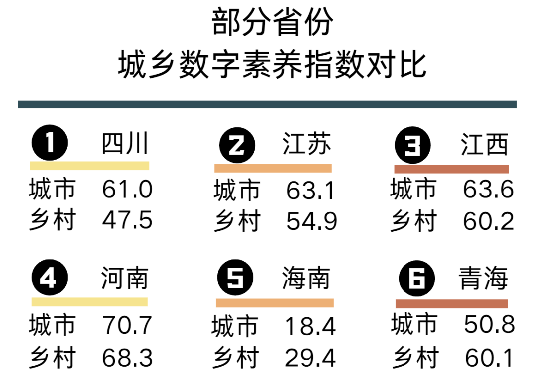 总体来看,城乡数字素养差距客观存在,但其幅度与方向在不同地区存在显著差异。未来应继续加强数字基础设施与终端普及,同时在乡村地区重点推动数字政务、远程教育、数字医疗等公共应用落地,并开展针对性培训,提升居民数字使用能力。