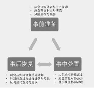 由重大突发事件引发的城市公共危机和应急防控是全周期管理的典型案例。城市面对重大灾害和公共安全的应急防控能力提升的任务目标,在时间维度上包括事前准备、事中处置与事后恢复三个重要节点,以形成城市应急防控治理的正反馈机制(图1),建立健全城市公共安全治理系统。事前准备重在对重大突发事件制定应急处理计划与预防工作安排;事中处置注重事故发生初期的有效组织、发生过程中的统筹指挥和协调机制;事后恢复注重事故发生后的有效控制和保障措施。