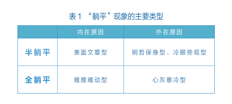以上列举的只是基层干部“躺平”的几种典型表现,事实上,现实生活中的“躺平”现象复杂多样,它们程度不同,原因各异。根据“躺平”的程度与原因,大致可以将其分为内在原因全躺平、内在原因半躺平、外在原因全躺平、外在原因半躺平四种类型,其中,全躺平是个别现象,半躺平则相对常见(具体归类参见表1)。