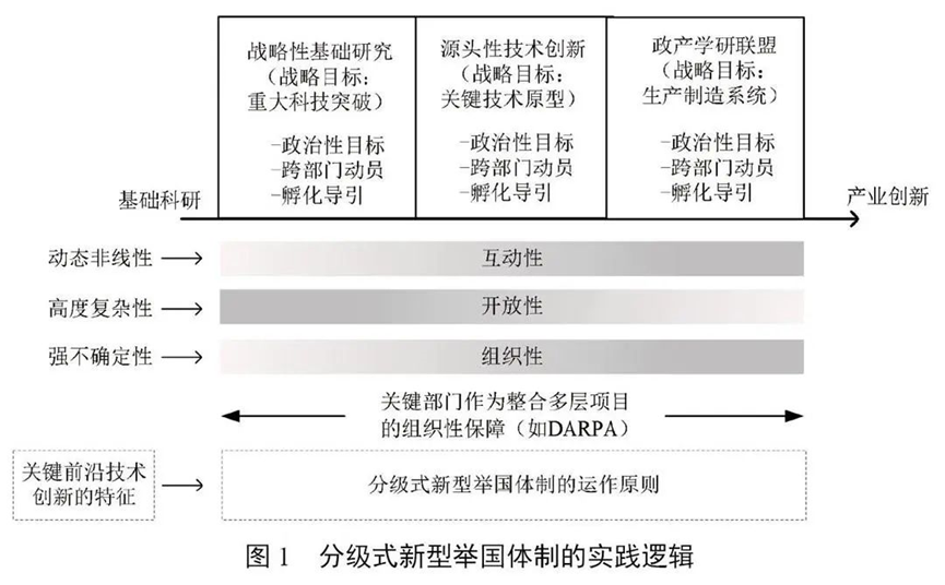 对新型举国体制运作机制的讨论不能违背创新的基本原则。创新在本质上不是一个线性的过程,而是各阶段持续往复互动的链式演进过程。创新包括从科学研究、技术概念验证、早期技术和产品开发到产业化应用的不同阶段,它们的活动性质、认知模式、激励机制的内在逻辑并不一致。这意味着,不同阶段活动的有效组织机制应当是有差异的。因此,在新型举国体制实践中,首先需要明确战略性目标的基本属性,即这些目标是重大科技突破、关键工程产品原型,还是生产制造系统。即便是在成功的创新经济体(如美国),国家也无法在单一项目中完成从科学研究到产业化应用全链条的创新活动。这要求国家在选定的领域内,通过一系列重大责任项目来分别瞄准重大科研突破、关键技术原型、生产制造系统,并将不同项目层层串联来实现重大战略性目标。本文将此称为“分级式新型举国体制”。